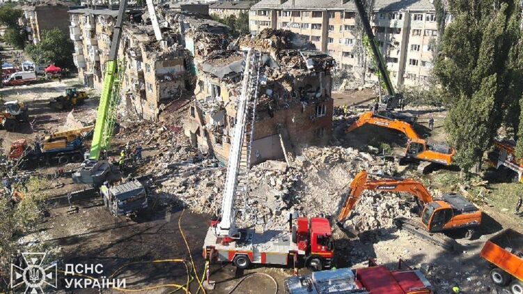 Ракета, за заявою МВС, потрапила до житлової п'ятиповерхівки на Дарниці, яка зазнала масштабних руйнувань. Під завалами досі шукають людей.