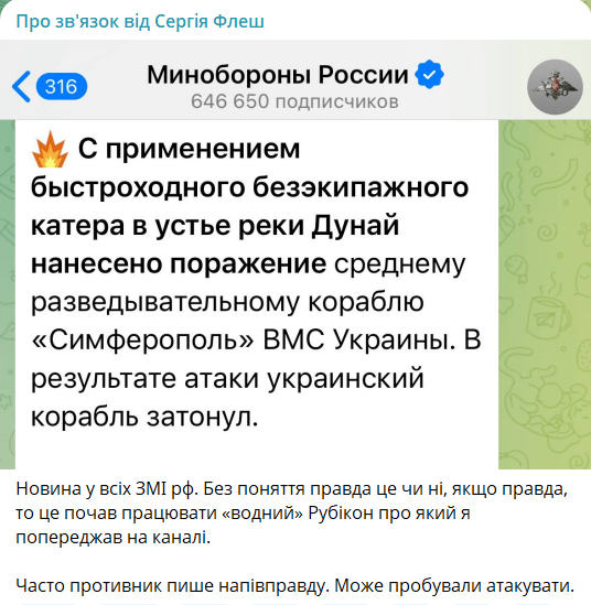 Раніше Флеш повідомляв, що центр безпілотних систем РФ "Рубікон" взяв на озброєння ударні катери. За його оцінкою, у майбутньому можливий одночасний удар 400 підводними та надводними катерами за аналогією з "Шахедами" по українських портах, вежах, кораблях та іншій морській інфраструктурі.