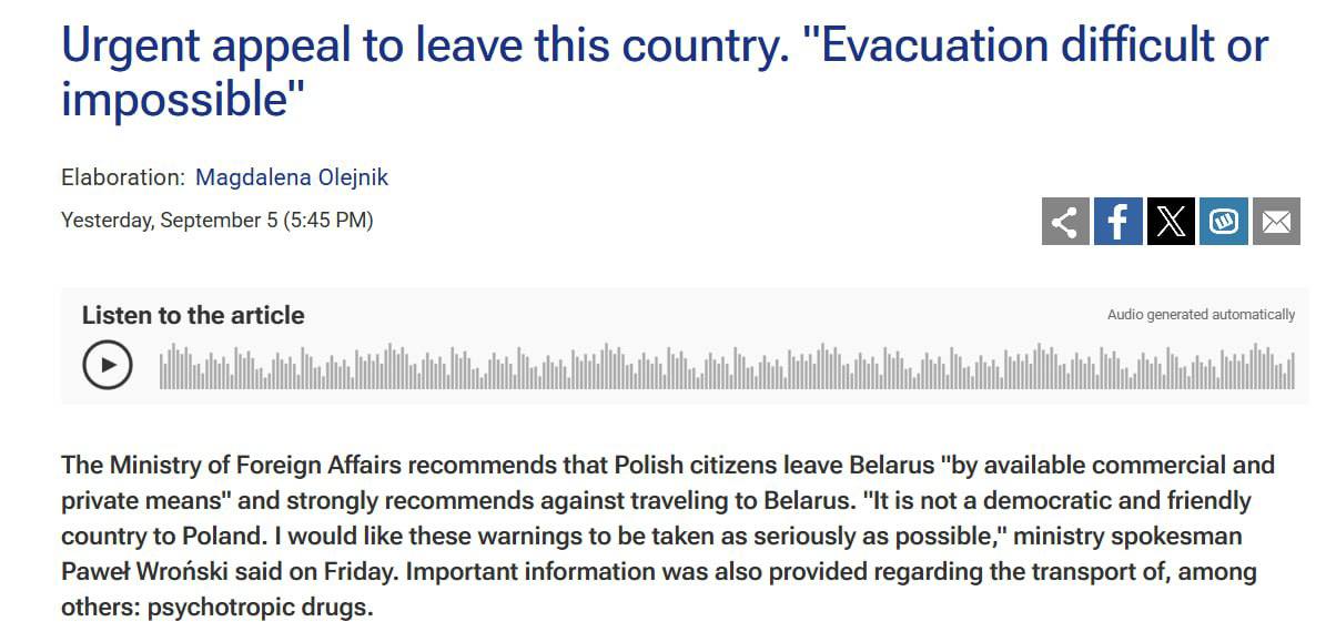 Відповідне термінове звернення до своїх громадян, які перебувають на території Білорусі, випустили у міністерстві закордонних справ Польщі.