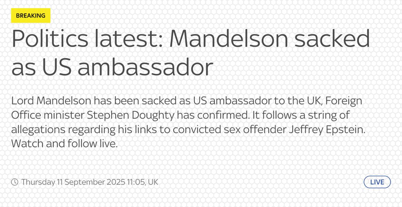 МЗС Великобританії звільнили посла в США Пітера Мандельсона через зв'язок із сексуальним злочинцем Джеффрі Епштейном.