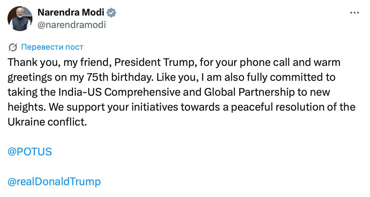 "Щойно відбулася чудова телефонна розмова з моїм другом, прем'єр-міністром Нарендрою Моді. Я привітав його з днем народження. Він робить колосальну роботу. Нарендра: дякую за вашу підтримку у припиненні війни між Росією та Україною!" – йдеться у повідомленні.