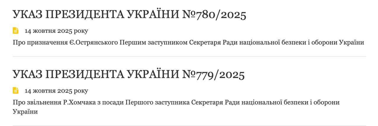 Президент України Володимир Зеленський звільнив першого заступника секретаря Ради національної безпеки і оборони (РНБО) Руслана Хомчака та призначив замість нього генерал-майора Євгена Острянського, який був заступником начальника Генерального штабу ЗСУ.