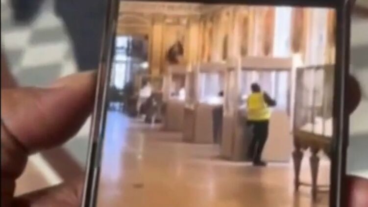 На кадрах чоловік у жовтому жилеті працівника музею зламує вітрину у галереї Аполлона. У цей час довкола спокійно ходять відвідувачі, не звертаючи уваги на те, що відбувається.
