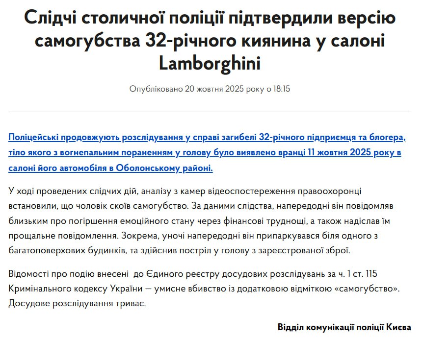 "Під час проведених слідчих дій, аналізу камер відеоспостереження правоохоронці встановили, що чоловік скоїв самогубство. За даними слідства, напередодні він повідомляв близьким про погіршення емоційного стану через фінансову скруту, а також направив їм прощальне повідомлення. Зокрема, вночі напередодні він припаркувався біля одного з них і припарковався біля одного вечора. зброї", – йдеться у повідомленні.
