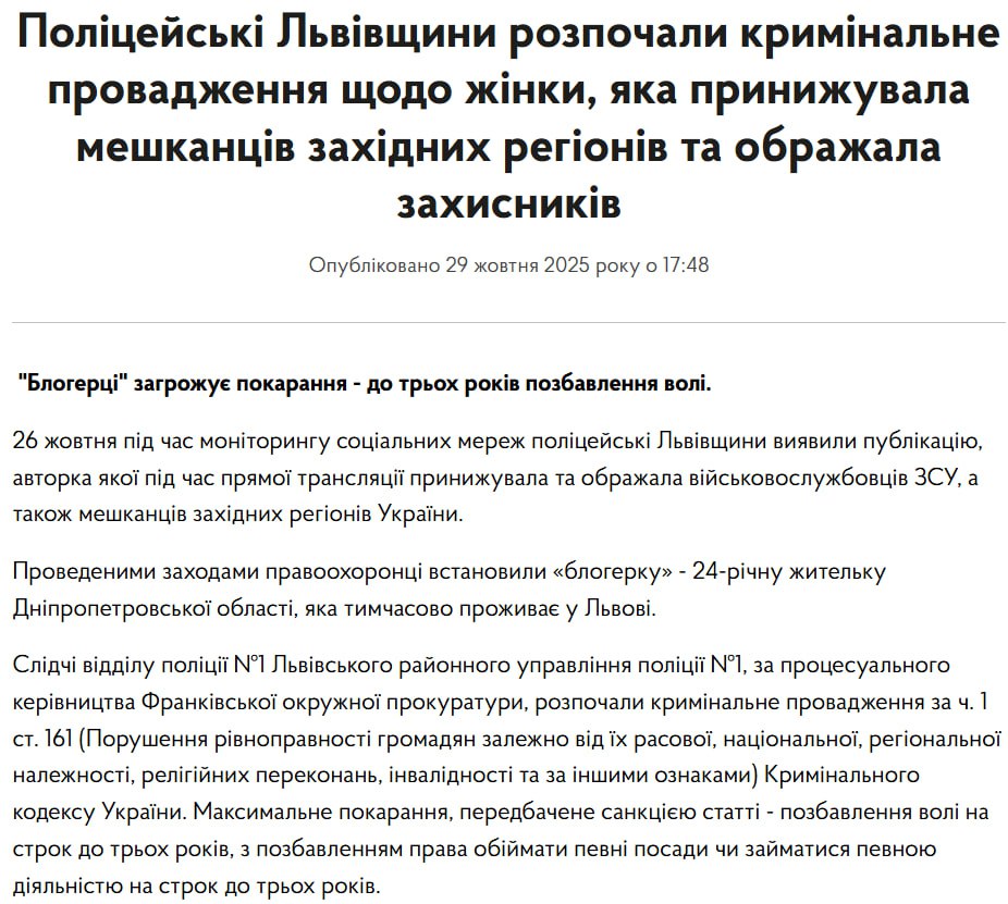 Поліція повідомляє, що слідчі порушили кримінальне провадження за ч. 1 ст. 161 КК – порушення рівноправності громадян за регіональною належністю. Зазначимо, що та сама стаття передбачає кримінальну відповідальність за дискримінацію за мовною ознакою, на яку скаржаться мешканці східних регіонів, які переїхали на захід України.