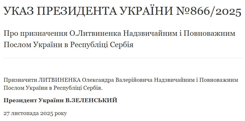"Призначити Литвиненка Олександра Валерійовича надзвичайним та повноважним послом України в Республіці Сербія", - йдеться у документі.