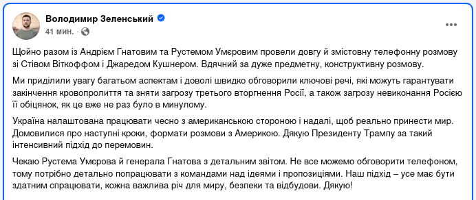Президент України Володимир Зеленський провів телефонну розмову зі спецпредставником президента США Стівеном Уіткоффом та зятем Дональда Трампа Джаредом Кушнером.