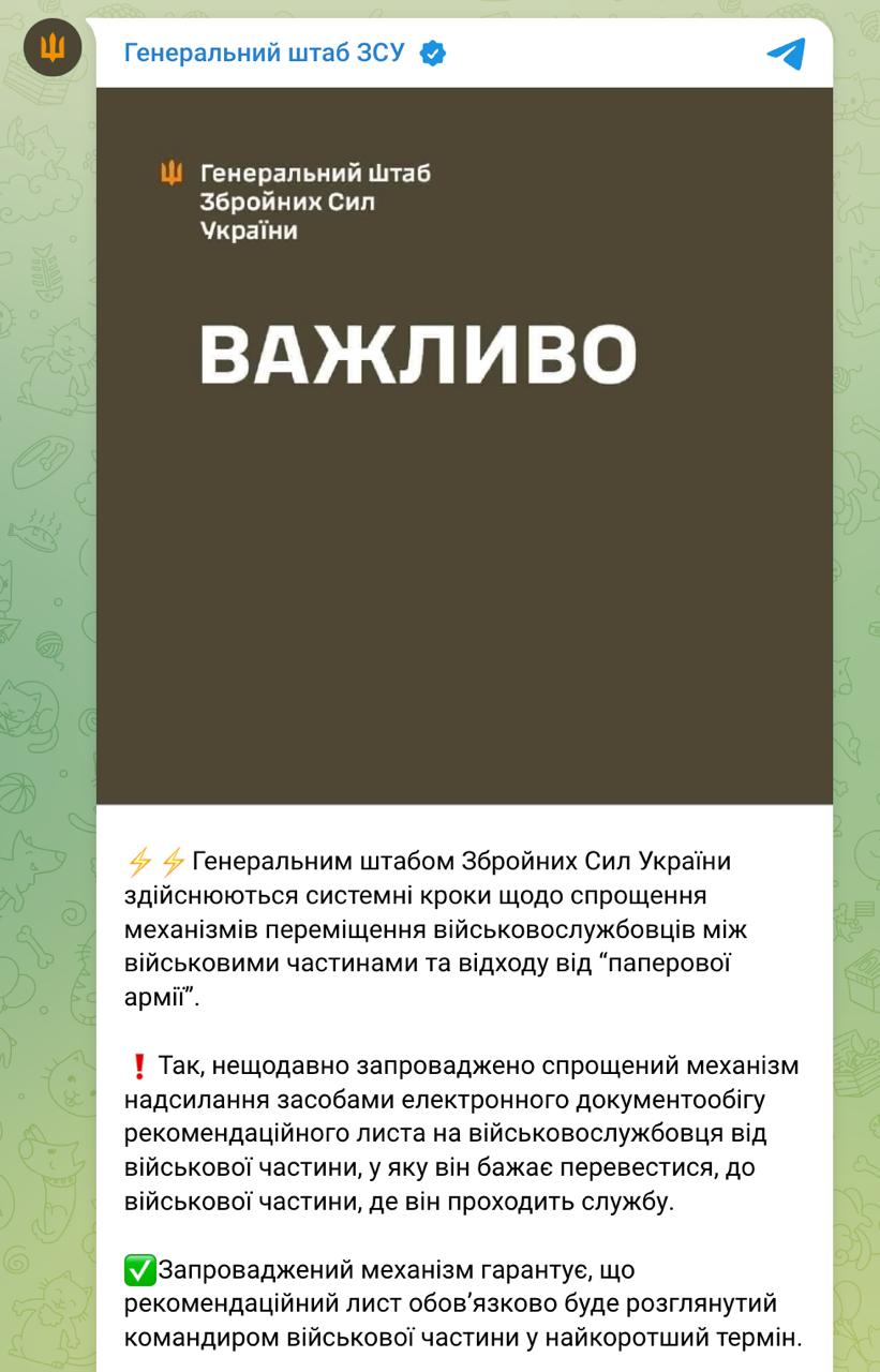 У той же час Генштаб підтвердив, що у бійців, які пішли в СЗЧ, не буде права самостійно вибирати частину, куди переводитися.