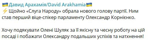 "Щойно "Слуга народу" обрала нового главу партії. Ним став перший віце-спікер парламенту Олександр Корнієнко", - написав Арахамія.