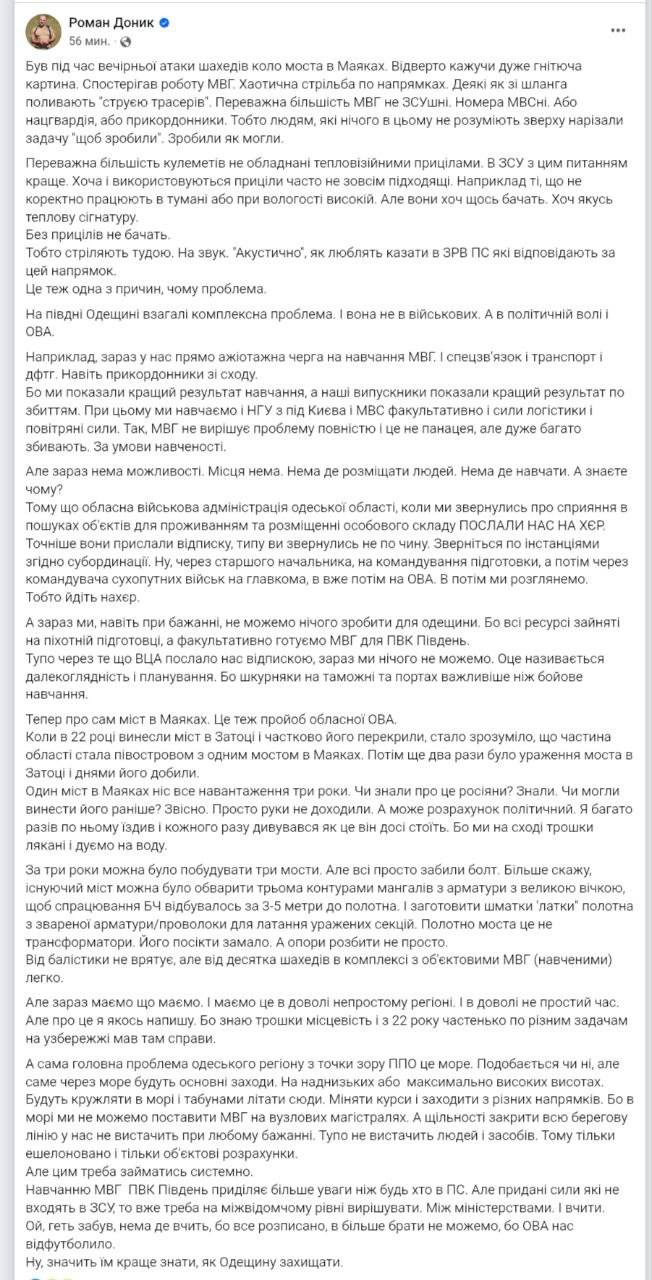 Ситуацію з мостом у Маяках Донік називає прямим прорахунком обласної влади. Він нагадує, що після ударів мостом у Затоці ще в 2022 році стало зрозуміло, що регіон фактично тримається на одній переправі.