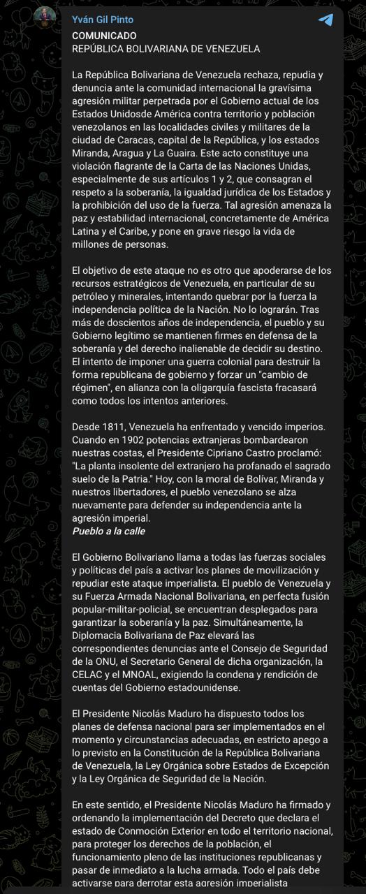 "Метою цієї атаки є захоплення стратегічних ресурсів Венесуели, зокрема її нафти та корисних копалин, з метою насильницького підриву політичної незалежності країни. Цього їм не вдасться досягти. Після більш ніж двохсот років незалежності народ і його законний уряд залишаються непохитними у захисті суверенітету", - додав він.