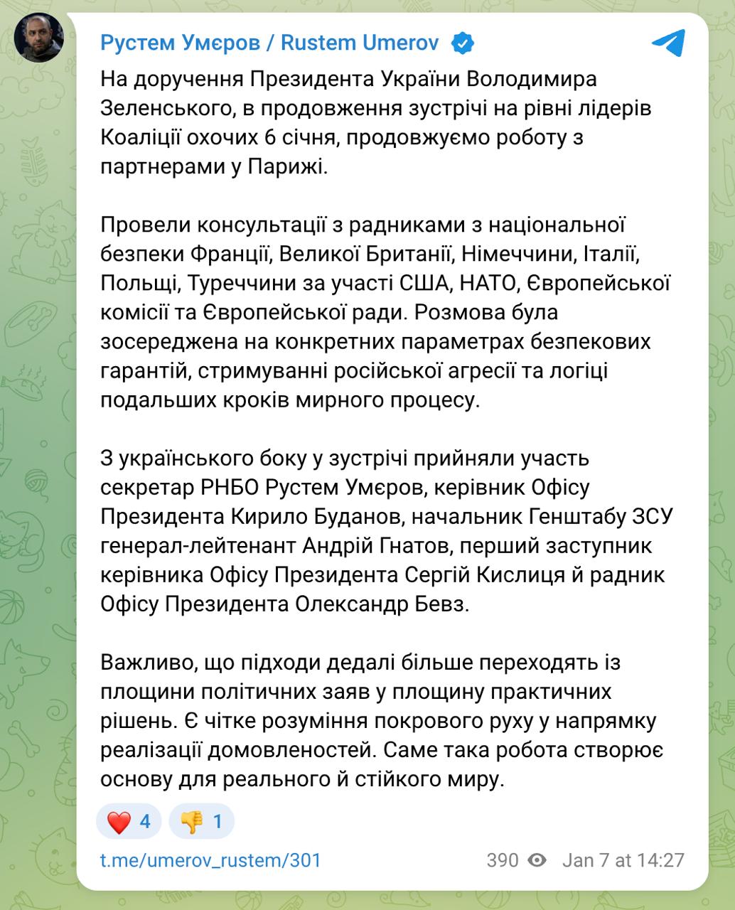14:38 Переговори з американцями у Парижі переходять до етапу практичних рішень, заявив Умеров.
