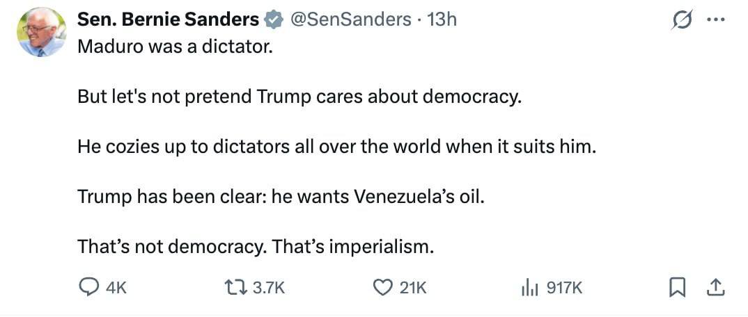 "Мадуро був диктатором. Але давайте не будемо прикидатися начебто Трампу не наплювати на демократію. Він дає диктаторам комфорт у всьому світі, коли вони йому потрібні. Трамп висловився ясно: Йому потрібна венесуельська нафта. Це не демократія. Це імперіалізм", - заявив Сандерс.