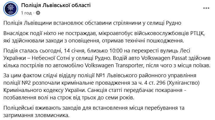 За даними правоохоронців, близько 10:00 на перехресті вулиць Лесі Українки та Небесної Сотні у селищі Рудно водій автомобіля Volkswagen Passat зробив кілька пострілів автомобілем Volkswagen Transporter, після чого втік з місця.