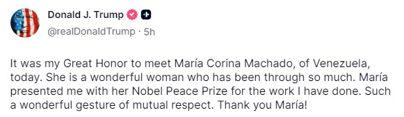 "Для мене було величезною честю зустрітися сьогодні з Марією Коріною Мачадо з Венесуели. Вона чудова жінка, яка багато чого пережила. Марія вручила мені Нобелівську премію миру за мою роботу. Це був чудовий жест взаємної поваги. Дякую, Маріє!" - сказано у його публікації.