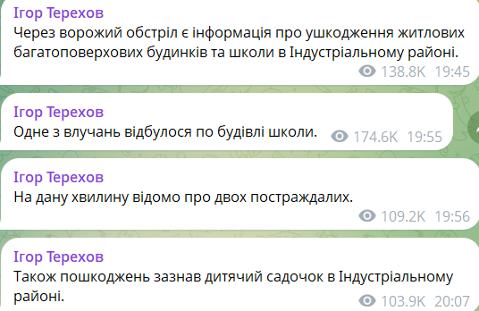 За словами Терехова, удар припав по Індустріальному району міста. На даний момент відомо про двох постраждалих, пошкоджено багатоповерхівку, школу та дитячий садок.