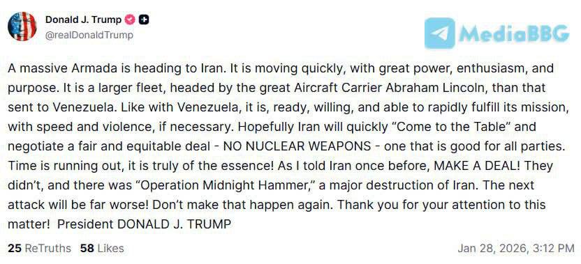 Американський президент Дональд Трамп заявив, що "велика армада" США на чолі з авіаносцем "Авраам Лінкольн" готова застосувати силу щодо Ірану.