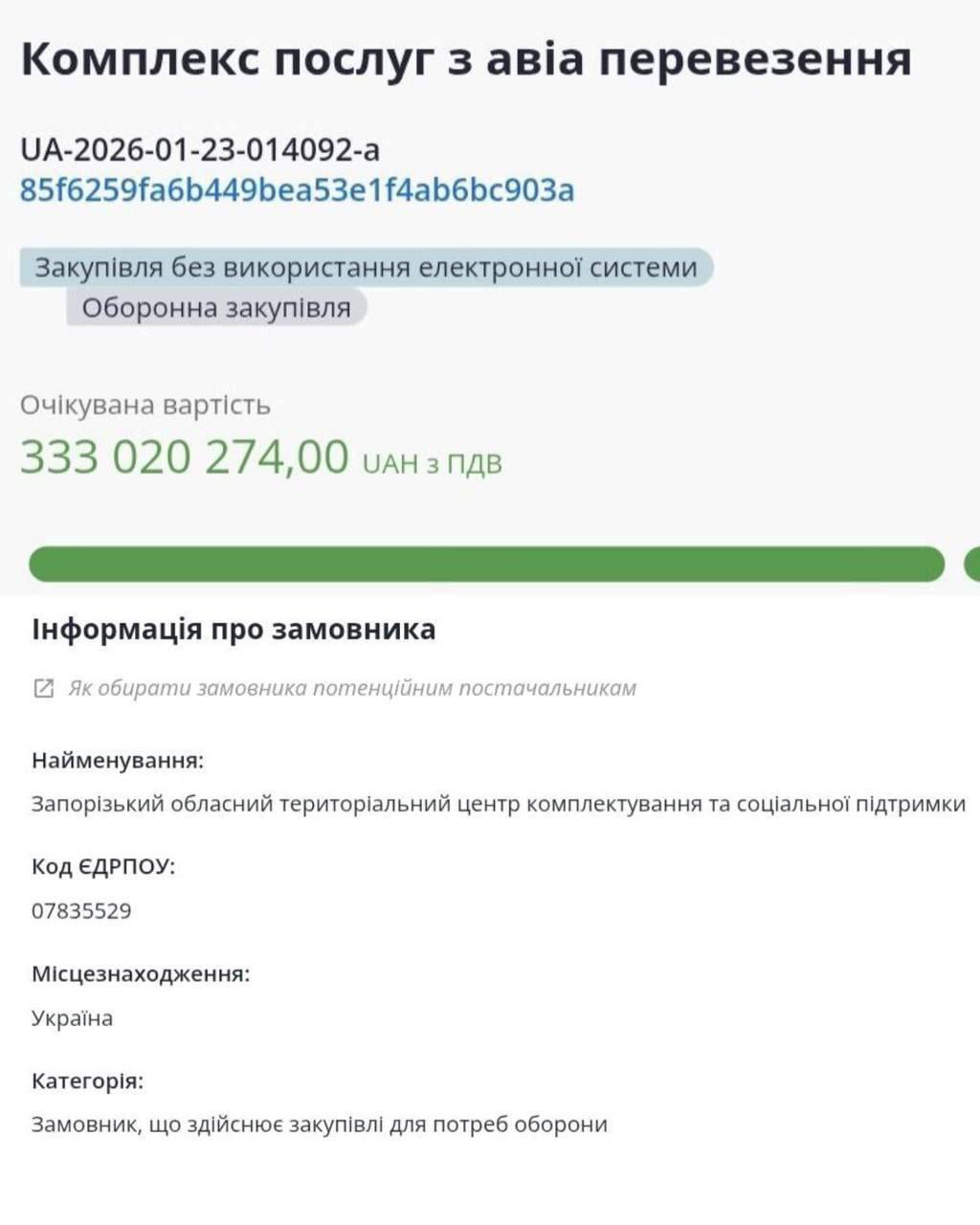 Запорізький обласний територіальний центр комплектування та соціальної підтримки замовив авіаперевезення на 333 мільйони гривень.