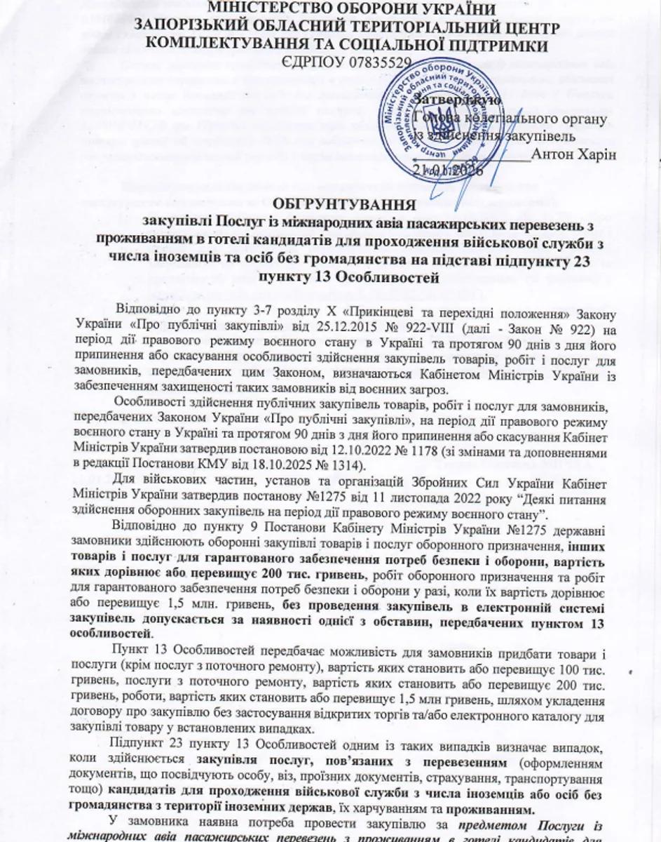 У документах сказано, що йдеться про закупівлю послуг, пов'язаних з перевезенням (оформлення документів, віз, проїзних документів, страхування, транспортування тощо), що засвідчують особу, кандидатів для проходження військової служби з числа іноземців або осіб без громадянства з території іноземних держав, з їх харчуванням та проживанням.