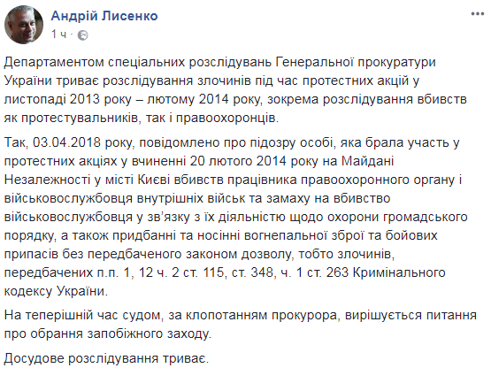 "03.04.2018 года сообщено о подозрении лицу, принимавшему участие в протестных акциях, в совершении 20 февраля 2014 года на Майдане Независимости в Киеве убийств сотрудника правоохранительного органа и военнослужащего внутренних войск и в покушении на убийство военнослужащего в связи с их деятельностью по охране общественного порядка, а также в приобретении и ношении огнестрельного оружия и боеприпасов без предусмотренного законом разрешения, то есть преступлений, предусмотренных п.п. 1, 12 ч. 2 ст. 115, ст. 348, ч. 1 ст. 263 Уголовного кодекса Украины", - написал спикер Генпрокуратуры Андрей Лысенко на своей странице в Фейсбуке во вторник вечером.